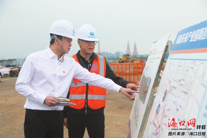 陈仁达(左)在海南未来产业园周边规划路项目(三期)施工现场,了解项目进展情况。记者龙易强 通讯员梁莹 摄