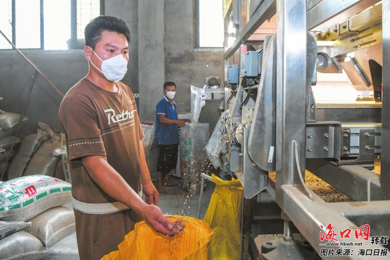 在大坡镇,海南杨元广胡椒贸易有限公司工作人员正仔细查看筛选后的胡椒颗粒。