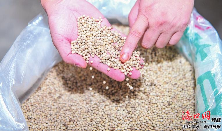 在大坡镇,海南杨元广胡椒贸易有限公司工作人员向记者展示经过仔细筛选后的胡椒颗粒。