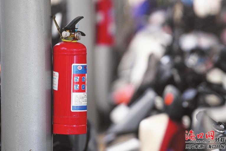 南方电网小区新建的电动自行车棚内按要求配备有消防灭火器。 记者 杨鹤 摄
