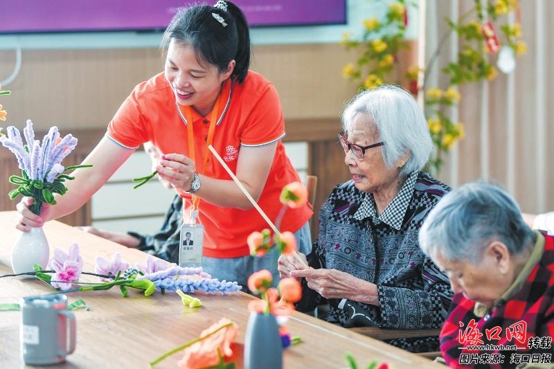 近日,记者走进老年人养护院(普亲养老·海口海甸岛院)高龄弱自理区看到,宽敞明亮的会客厅内,老人们正端坐在桌前,在护理人员的指导下制作绒花,气氛一片融洽。