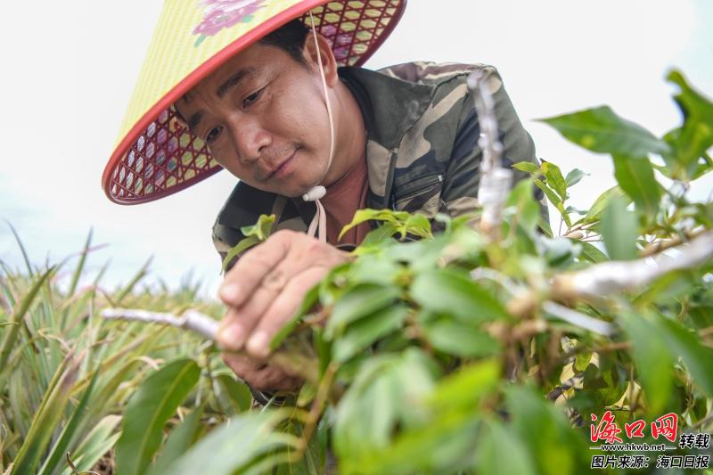 “理事长,我们的新品种今天就可以嫁接完,大家都说这个新球蜜荔品种市场前景好啊。”11月10日上午,琼山区三门坡镇红明37队的一处荔枝园里,种植户苏运剑兴奋地带着三门坡镇荔枝产业链党委副书记、三门坡金绿果水果产销专业合作社负责人王录理,查看正在进行嫁接的荔枝树苗。