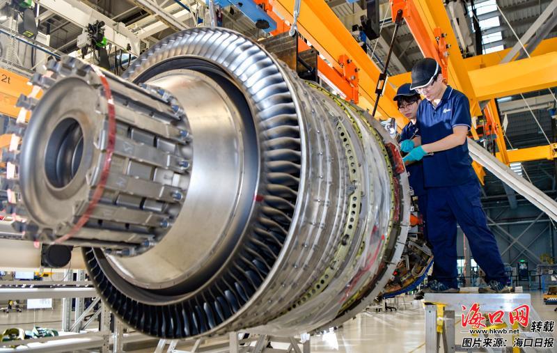 近日,海口美兰空港吉耐斯航空发动机维修工程有限公司车间内一派繁忙景象,工作人员正操作专业设备对一台航空发动机进行拆解检修。