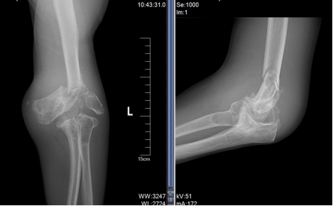 近日,郭先生再次不幸遭受外伤,让他本就脆弱的左肘关节再次发生骨折。这次,他下定决心,一定要彻底解决这个困扰了他大半生的“老问题”。于是,慕名找到海南医科大学第一附属医院关节外科贾丙申主任。就诊时,郭先生的左臂需要通过右手辅助支撑方可抬起,如果松开右手,左臂将会垂落。