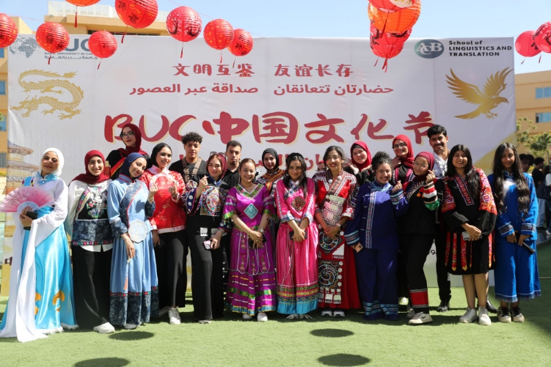 10月20日,在埃及开罗,学生在开罗巴德尔大学举办的中国文化节上展示中国传统民族服饰。新华社记者 隋先凯 摄