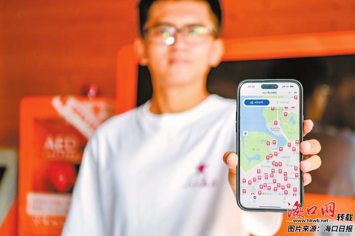 万绿园急救安全屋内,工作人员打开手机,展示海口市内AED设备分布图。记者 苏弼坤 摄