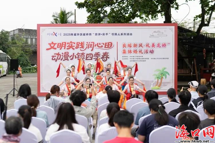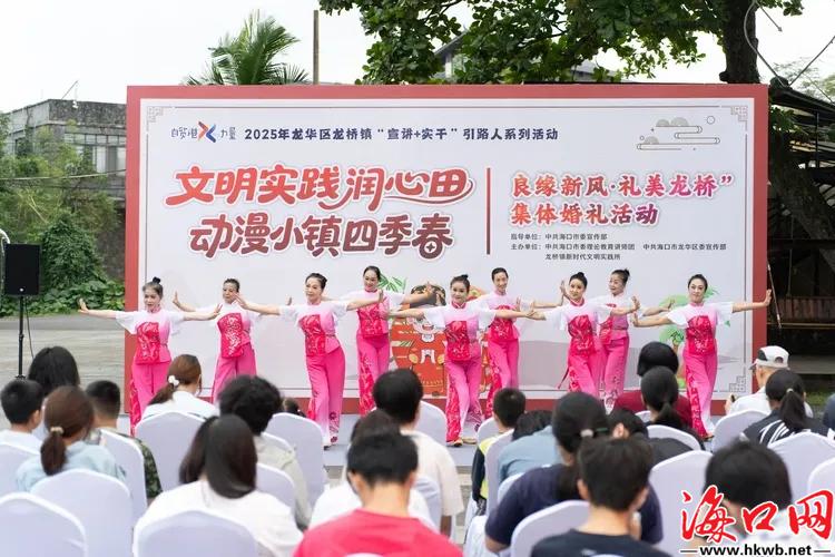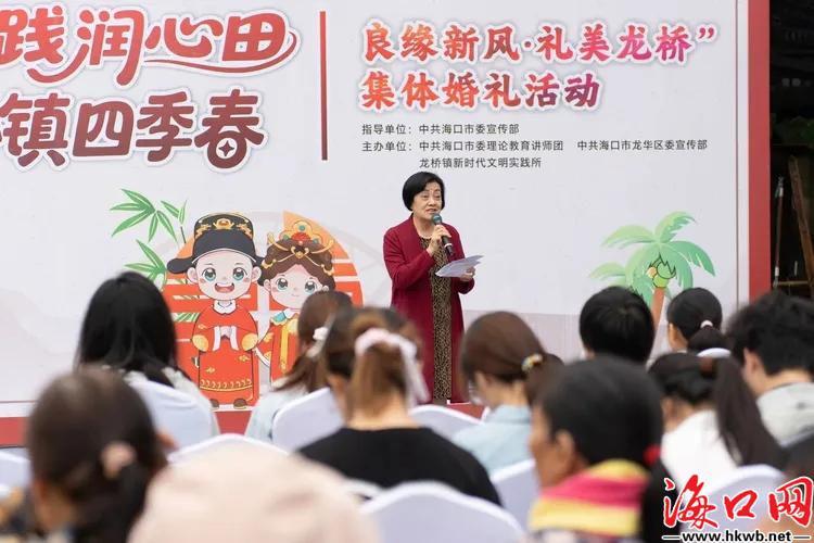 海口网11月17日消息(记者史子杨 特约记者萧海山)集体婚礼倡新风,简仪嘉礼沐春晖。近日,由海口市委理论教育讲师团、龙华区委宣传部和龙桥镇新时代文明实践所联合主办的“良缘新风·礼美龙桥”集体婚礼活动在龙桥镇文化站广场举行。旨在通过多样、文明的婚俗活动倡导婚事新办、简办的社会风尚,弘扬文明节俭的现代婚恋观念。