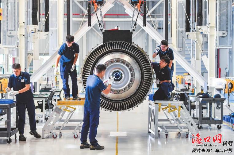 近日,在位于海口空港综保区的海南自贸港一站式飞机维修产业基地,海口美兰空港吉耐斯航空发动机维修工程有限公司的工作人员正在检修航空发动机。 记者 苏弼坤 摄