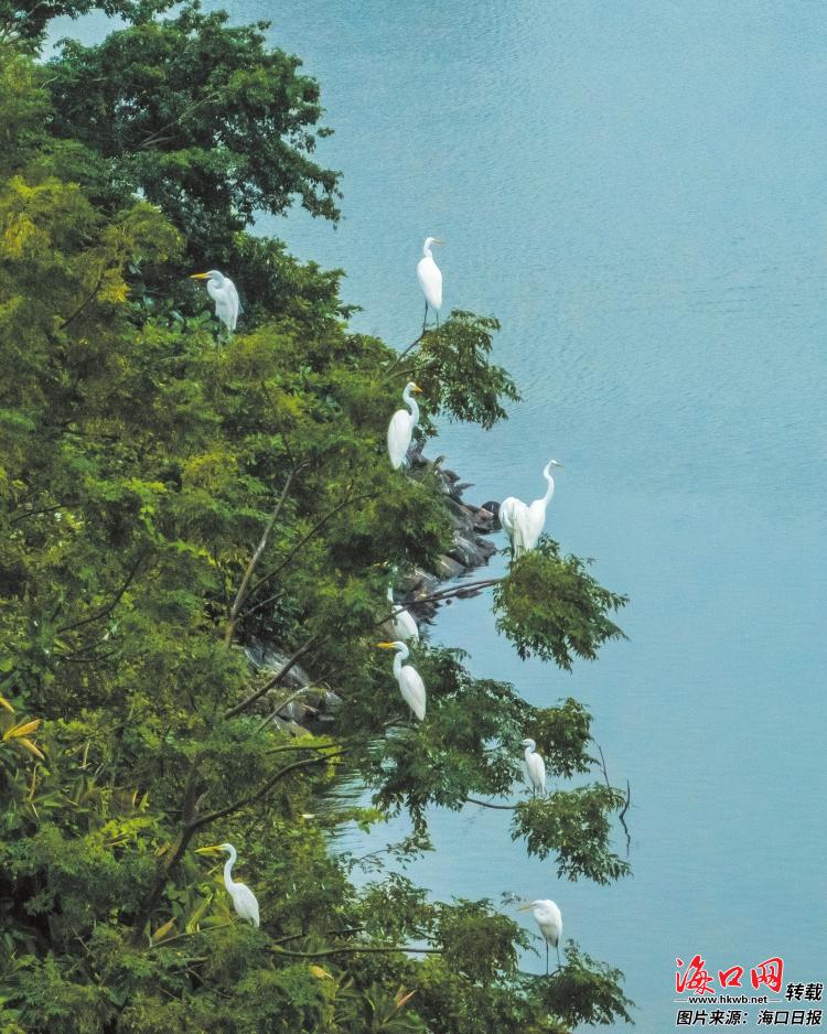“快看,又一群白鹭飞起来了!”11月17日下午,在海口红城湖公园的滨水栈道上,市民符先生指着湖心岛向同伴示意。澄澈的湖面上,成群白鹭或展翅掠过水面,或静立树梢梳理羽毛,与周边的城市楼宇相映成趣,在闹市区铺开一幅人与自然和谐相处的灵动生态画卷。