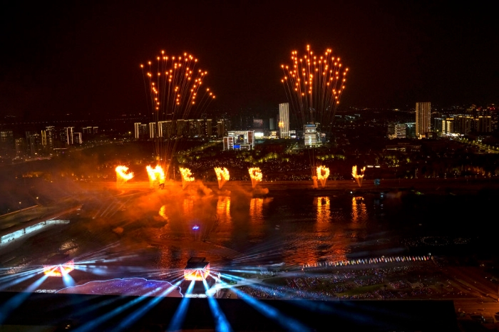 2025年8月7日在成都拍摄的第12届世界运动会开幕式上的焰火表演。焰火中的“成都”来自青铜器上的篆书铭文。通过现代科技的烟火表演,将古蜀文明展示给全世界观众。