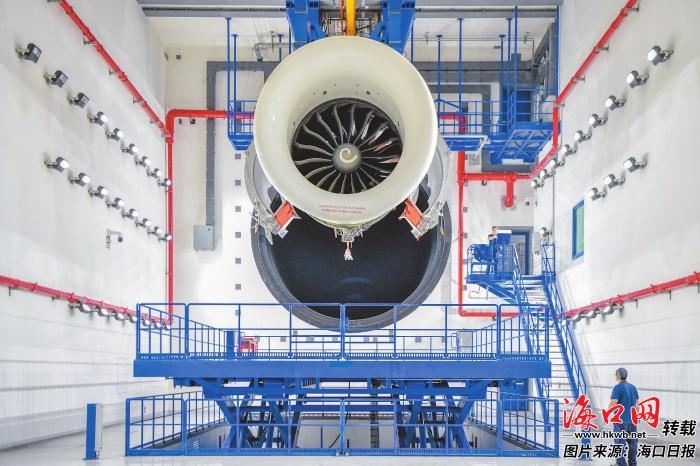 在海口吉耐斯试车中心,一台飞机发动机准备试车。