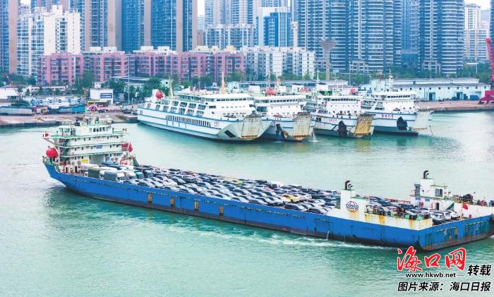 11月17日,绿源二号轮渡载着新能源汽车行驶在琼州海峡上。