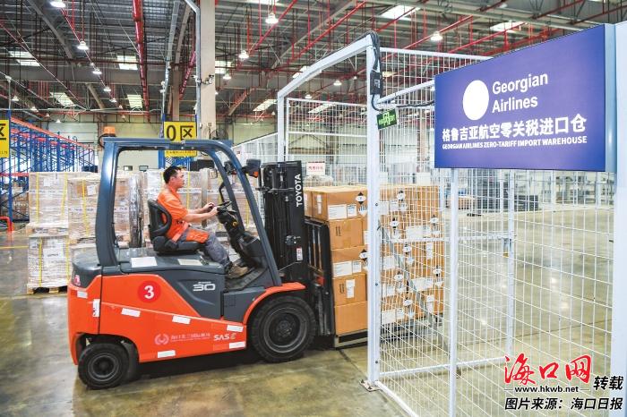 工作人员在海口美兰国际机场国际货站格鲁吉亚航空零关税进口仓搬运货物。