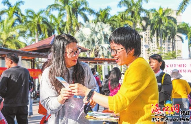 在海口市“11·25”国际消除家庭暴力日宣传活动上,工作人员向市民发放反家庭暴力宣传册。 记者 康登淋 摄