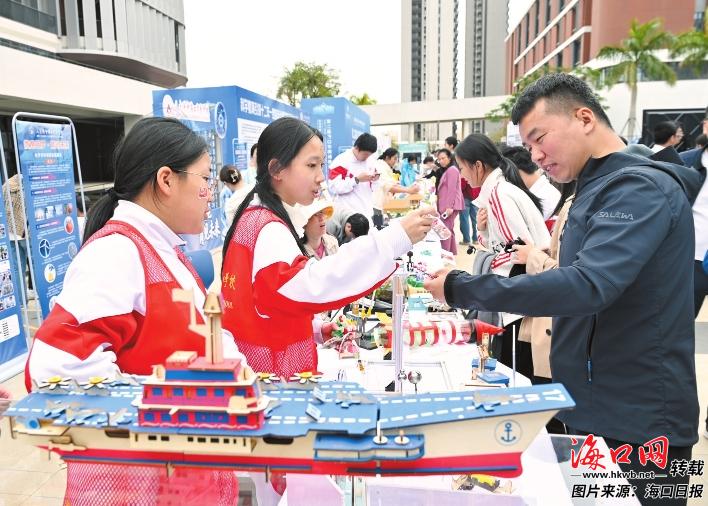 科技风、数智化吸引参观者驻足欣赏。海南华侨中学带来的机器狗随乐起舞,引得阵阵惊叹;海口市第一中学初二学生胡瀚超通过手机编程,指挥智能科考车模型执行精准抓取、搬运等动作;人大附中海口实验学校初二学生温崇浩通过操控水下机器人,开展模拟探测任务……“活动非常有趣,我在这里感受到了科技的魅力。”海口市滨海第九小学三年级学生罗继凡体验无人机操作后,满脸兴奋。