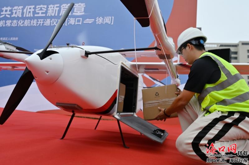 12月1日,海南顺丰跨海峡低空无人机常态化航线开通。图为工作人员将货物放入丰舟90无人机货仓内。记者 石中华 摄