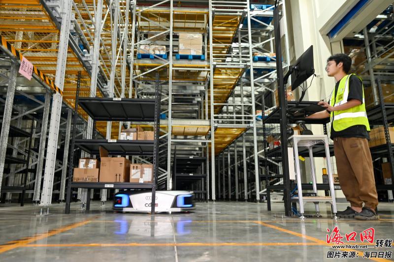 近日,在海口综保区中免海南国际物流中心2号仓库内,工作人员正在操作智能机器人搬运货物。 记者 石中华 摄