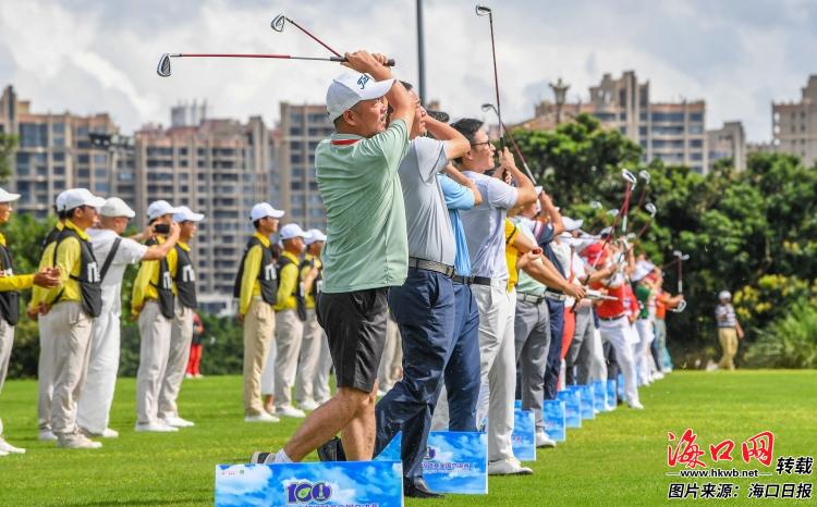 第九届高尔夫超级联赛,参赛选手们在海口观澜湖高尔夫球场上为赛事开球。 记者 康登淋 摄