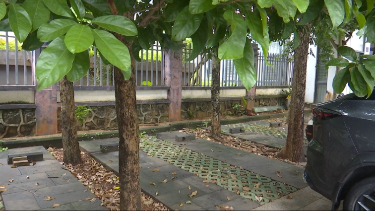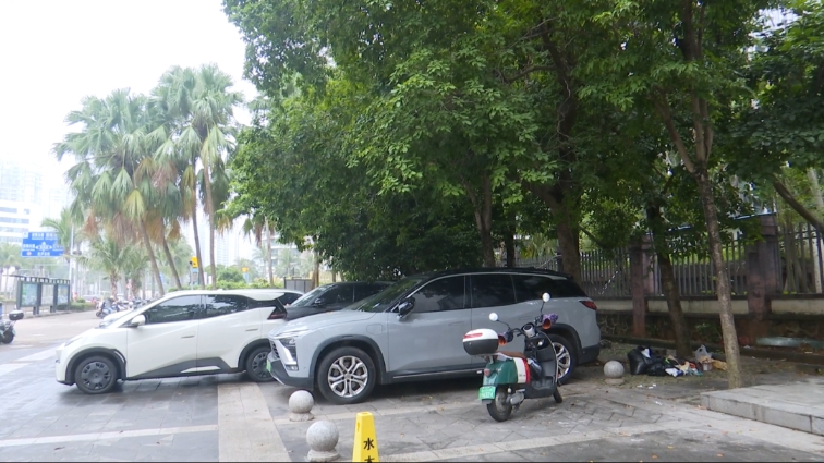 杨先生 中海物业美源日月城物业服务中心经理:那个地方它有树木,你要挪那个树,还不能私自把那个树给砍了,所以说我们现在这个场地,目前就是暂时放在大门口这样一个区域,但这个地方也只是一个临时的区域,我们后面就是要把树挪走,通过园林局的审批,审批以后才能去做这件事。