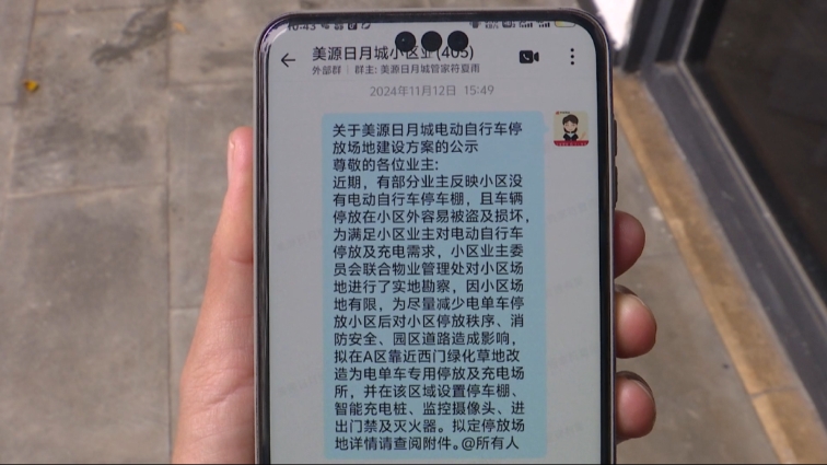 杨先生 中海物业美源日月城物业服务中心经理:因为我们小区外面,原先开发商是没有建停车棚的,就等于说要新建这个停车棚,所以我们当时也征集了业主的意见,在小区也找了个地方,就是在东门的一个位置,当时也让业主进行投票 这个区域可不可以,但是后面遭到部分没有电动自行车业主的反对,说那个电动自行车停在那里,影响业主的休息,后面没办法这个事就搁置了。