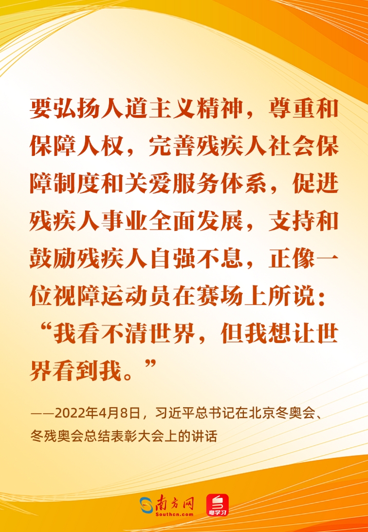 习近平总书记高度重视残疾人事业发展,格外关心、关注残疾人群体,将残疾人事业称为“春天的事业”,并指出:“健全人可以活出精彩的人生,残疾人也可以活出精彩的人生。”