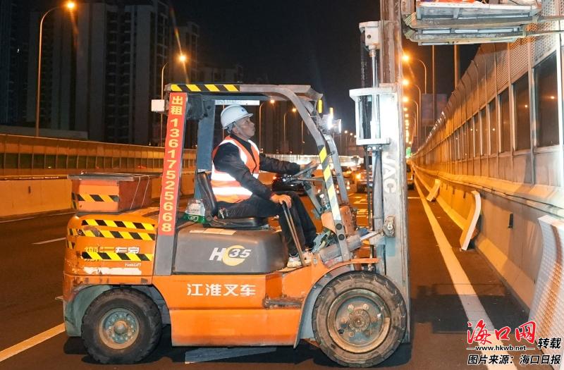 12月6日23时30分,海秀快速路东往西永万路至长天路路段,夜色渐深,车流趋缓。在临时占用的右侧车道内,工程灯将作业区照得通明,施工人员正有序进行声屏障构件的拆卸、搬运与安装。该作业现场属于海秀快速路(一期)声屏障更换工程。