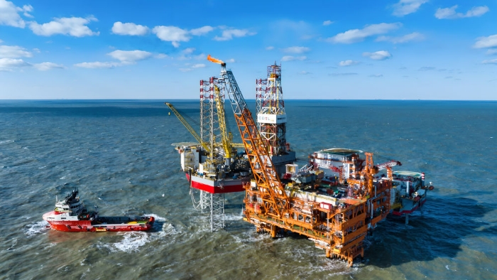 这是2025年2月8日拍摄的渤中26-6油田一期开发项目海上作业平台(无人机照片)。新华社发(杜鹏辉 摄)