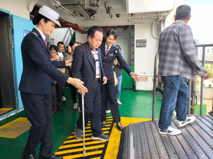 原来在11日11时55分,正准备从南港开往北港的“粤海铁1号”船舶上,迎来了一位视障且腿脚不便的轮椅旅客,在登船口引导旅客的客运服务员曾金瑞发现旅客的特殊情况后,赶紧上前搀扶,将其引导至客舱特殊位置入座。