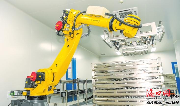 在海口药谷工业园的海南皇隆制药股份有限公司内,机械手臂将已装筐的药剂转移至托盘。