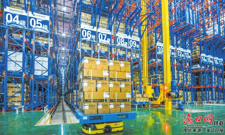 在海南倍特药业海口生产基地的智能立体仓库内,AGV小车往来穿梭装卸药品货物。