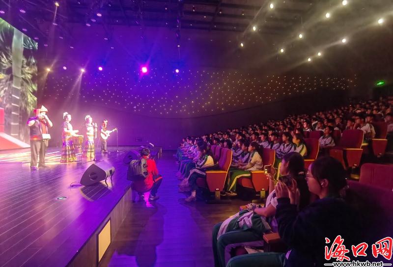 剧场内,同学们还聆听了悠扬的黎族民歌与古朴的鼻箫演奏,并参与了节奏明快的竹竿舞互动,现场欢呼声、笑声、掌声不断。这种“可听、可看、可参与”的节目设置,让静态的知识鲜活起来。