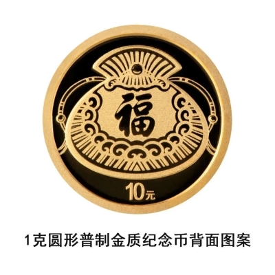 1克圆形金质纪念币背面图案为“福”字、荷包组合设计,并刊面额。