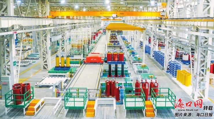 在金盘科技海口数字化工厂装配车间里,无人运输车往来搬运物料,一台台干式变压器通过多道工序后走下生产线。