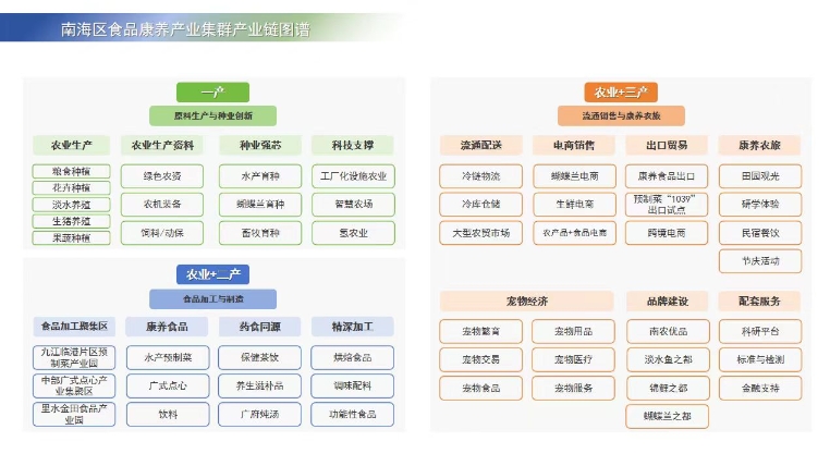 近年来,南海区以“百千万工程”实施、环两江先行区建设为引领,以工业化思维推动高水平农业“接二连三”发展,大力建设食品康养产业集群,围绕“农业+食品+文旅+康养+文化”,推动食品生产、加工、流通、餐饮、康养文旅等全链条集群发展;持续招商引资,推动康养食品产业提质扩容。