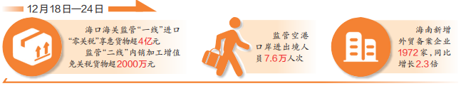 记者25日从海口海关获悉,封关首周(12月18日—24日),海关共监管“一线”进口“零关税”享惠货物超4亿元;监管“二线”内销加工增值免关税货物超2000万元,政策红利持续释放、产业发展动能持续增强。