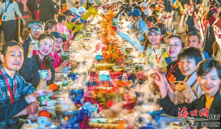 12月27日,在海口日月广场,马拉松跑友与市民游客共享火锅长桌宴。记者 康登淋 摄