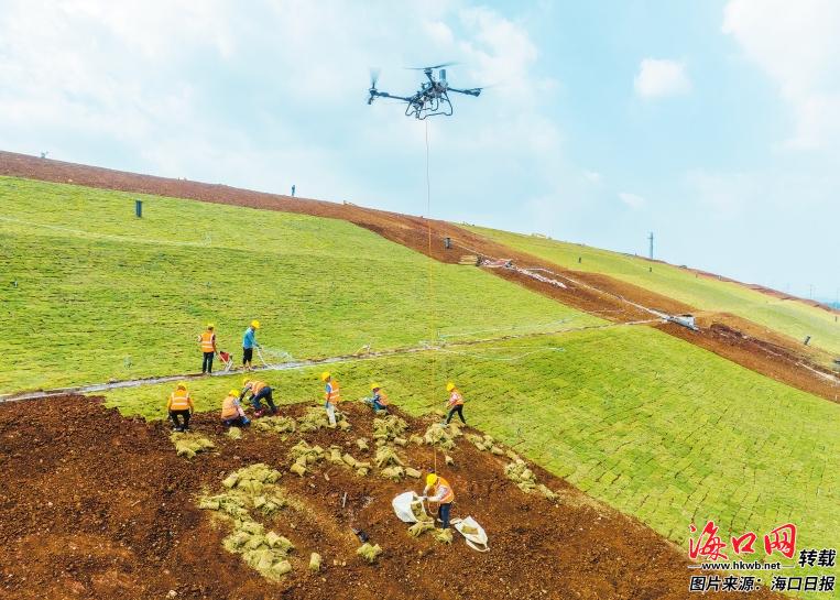 12月29日,海口市颜春岭生活垃圾填埋场环境治理和生态修复工程项目现场繁忙有序。工作人员正操作无人机吊运草皮,积极推进草坪铺设作业。