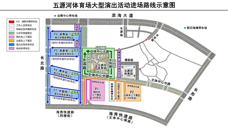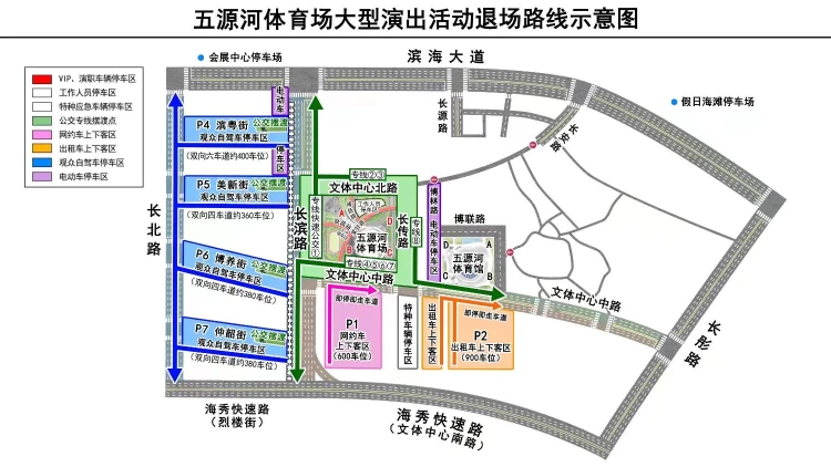 进退场期间的长滨路、文体中心中路、长传路、文体中心北路道路将根据车流量实施适时交通管控措施。