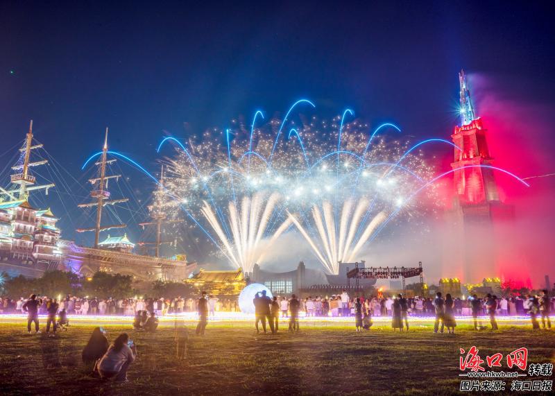 元旦假期,海口丰富多彩的文旅活动,吸引众多市民游客热情参与。图为市民游客在海南长影奇幻乐园欣赏烟花秀。记者 石中华 摄
