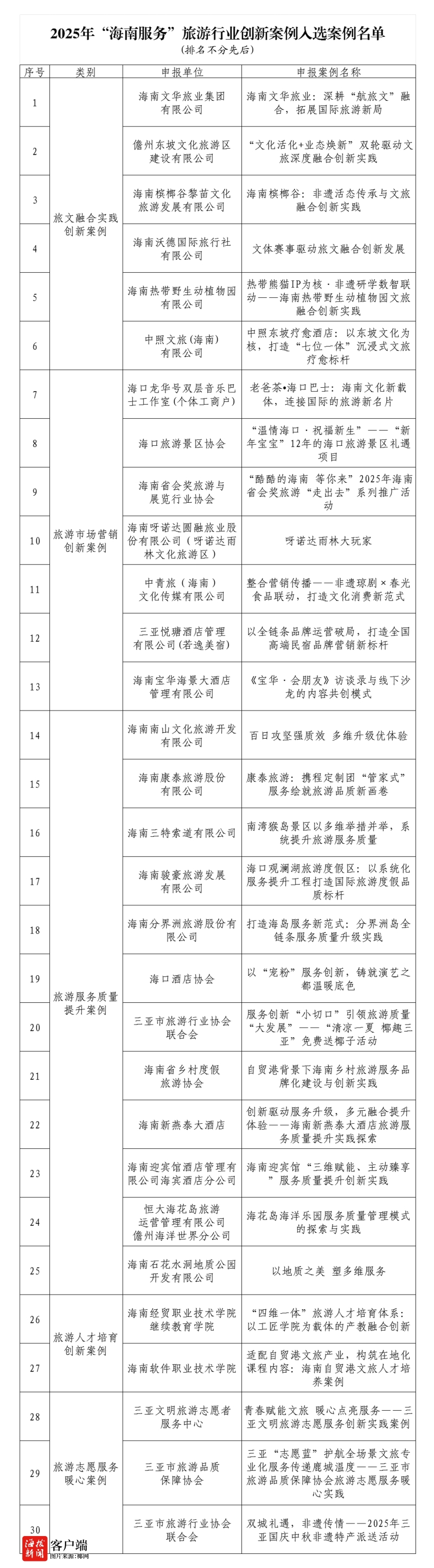 近日,在海南省旅游和文化广电体育厅指导下,由海南省旅游协会组织遴选的2025年“海南服务”旅游行业创新案例完成公示,入选名单现正式揭晓。经自愿申报、专家评审、社会公示等流程,共有30项具有示范性、创新性和推广价值的案例成功入选。
