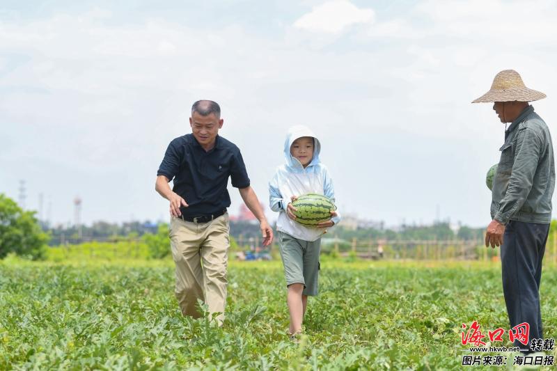 2025年5月,在灵山镇晋文村,陈燕明带着游客小朋友采摘“晋文西瓜”。记者 苏弼坤 摄