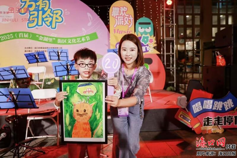 在2025(首届)“金湖里”街区文化艺术节拍卖环节,董飞作为活动策划、主持人帮助小朋友拍卖画作。 (受访者供图)