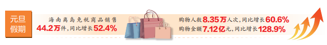 期待足,政策活,全岛免税店齐升温。据海口海关数据统计,元旦假期,海南离岛免税商品销售44.2万件,同比增长52.4%;购物人数8.35万人次,同比增长60.6%;购物金额7.12亿元,同比增长128.9%。