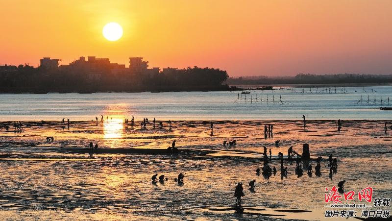 在演丰镇北港岛,朝阳将滩涂染成金色,游客手提小桶、脚踩滩涂,弯腰拾捡蛏子蛤蜊,勾勒出一幅生动的赶海画卷。 记者 康登淋 摄