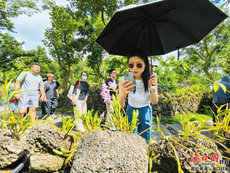 在石山镇施茶村的火山石斛园内,游客拍摄盛开的石斛花。记者 石中华 摄