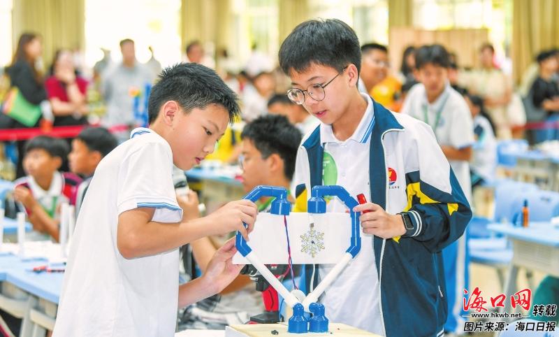 在海口市首届中小学生劳动节暨劳动技能大赛现场,学生们比拼技能、释放压力。 记者 康登淋 摄