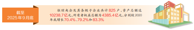 数据显示,截至2025年9月底,驻琼央企及其各级子企业共计825户,资产总额达10238.7 亿元,所有者权益总额为4385.4亿元,分别较2020年底增长70.4%、79.2%和83.3%。2025年1—9月,央企在海南规模、效益、贡献增幅均高于全国平均水平。