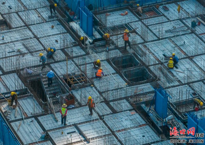 在海口市秀英区业里广场城市更新项目现场,工人正在绑扎钢筋。记者 石中华 摄
