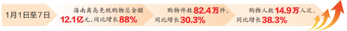记者1月8日从海口海关获悉,今年开年首周(1月1日至7日),海南离岛免税购物总金额12.1亿元、件数82.4万件、人数14.9万人次,同比分别增长88%、30.3%、38.3%。