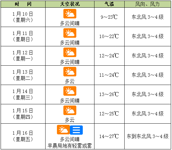 预计,1月10日~16日,受冷空气影响,我市以多云间晴天气为主,其中16日早晨局地有轻雾或雾。10日~11日,最低气温9~10℃;12日~16日,气温缓慢回升,最低气温11~14℃,最高气温24~27℃。